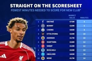 体育资讯10月8日讯 德国转会市场统计了今夏新援攻入处子球的时间,并排出最快处子球榜单,埃基蒂克4分钟攻入首球居首。